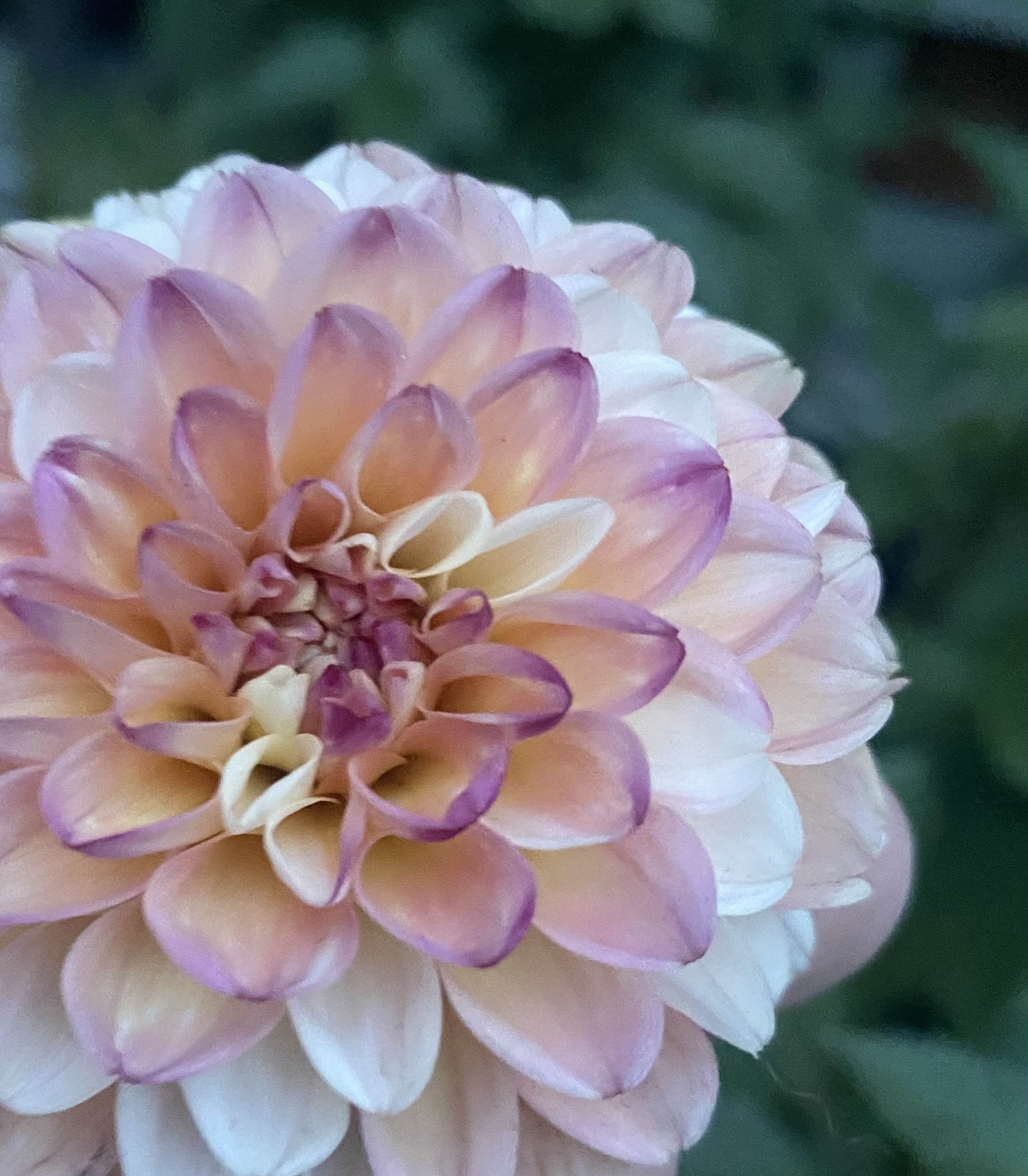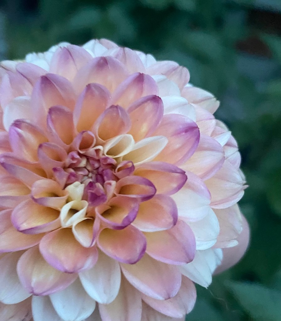 Last night, I discovered the most beautiful dahlia in my garden. It is a small bloom. The outer petals are a mix of pale cream and pink. Some of the pink petals have soft veins of purple running through them. These are followed by rows of peach petals with light mauve edges and purple tips. Tucked randomly among these are warm butter yellow petals. At the centre of the flower, all the petals hug each other closely in a tight circle. I gently pull apart some of the petals, and I am surprised to discover they are bright yellow at the heart of the flower. As I gently examine this dahlia, I am mesmerized by its intricacies and uniqueness.